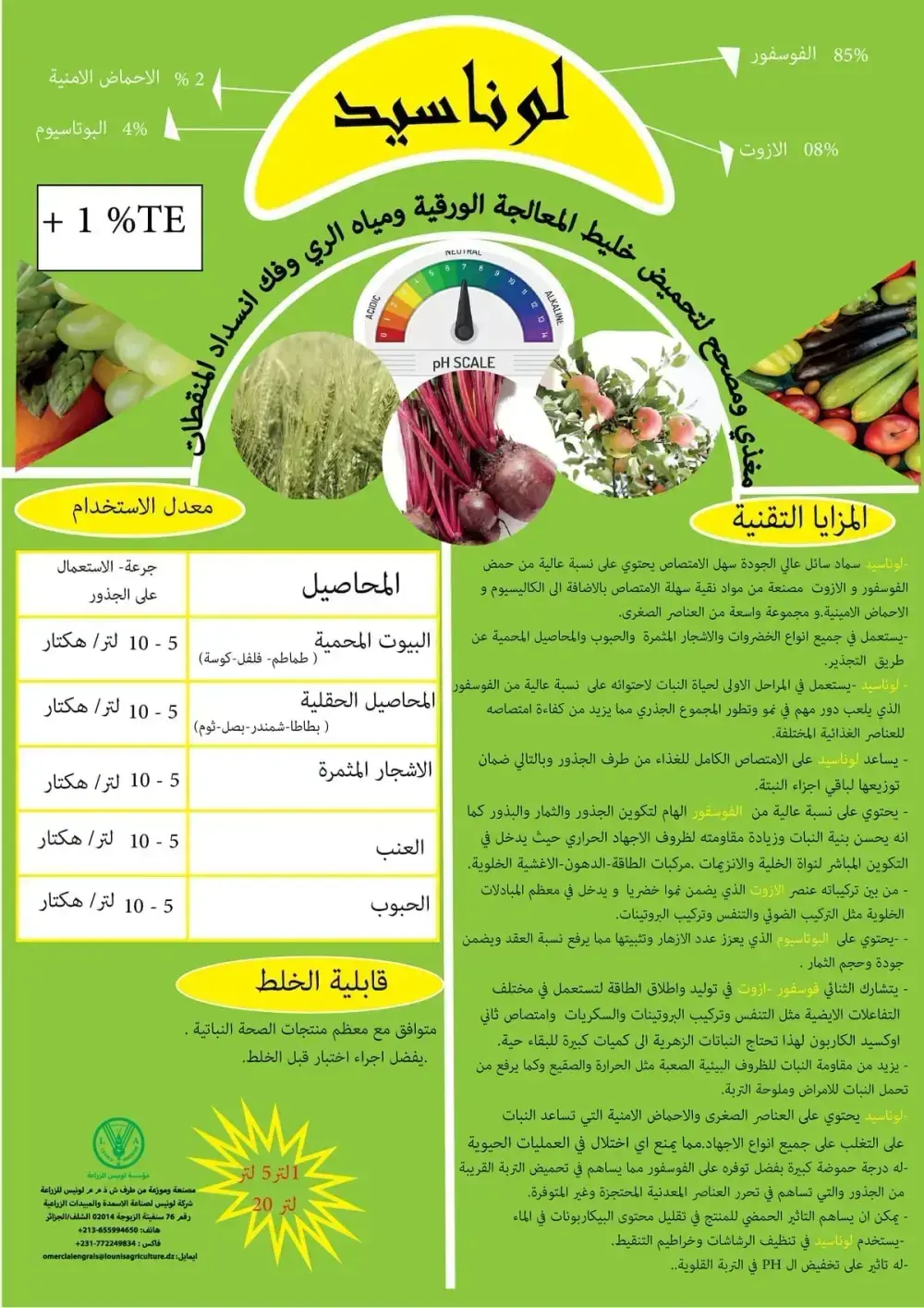 | المحاصيل الحقلية (بطاطا - شمندر - بصل - ثوم) | 5 - 10 لتر / هكتار | جرعة الاستعمال على الجذور |