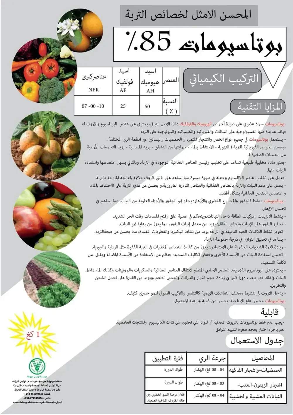 بوتاسيومات سماد عضوي يجمع بين أحماض الهيوميك والفولفيك مع البوتاسيوم والآزوت لتحسين الخصائص الفيزيائية والكيميائية والبيولوجية للتربة.