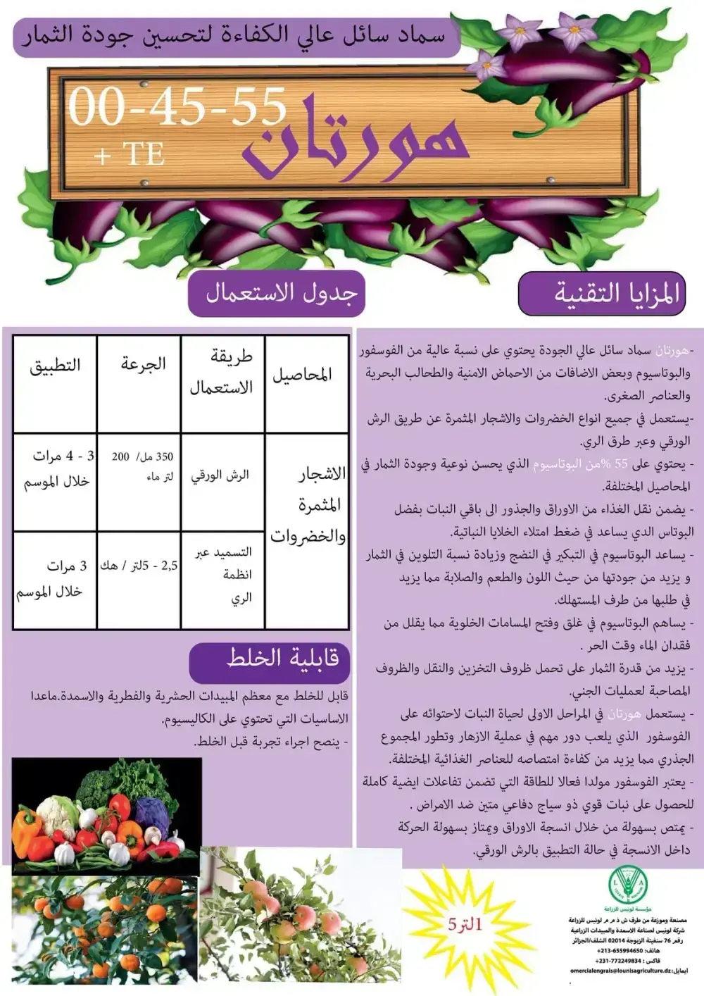 | الأشجار المثمرة والخضروات | 3 - 4 مرات خلال الموسم | 200 - 350 مل / 200 لتر ماء | 2.5 - 5 لتر / هكتار |