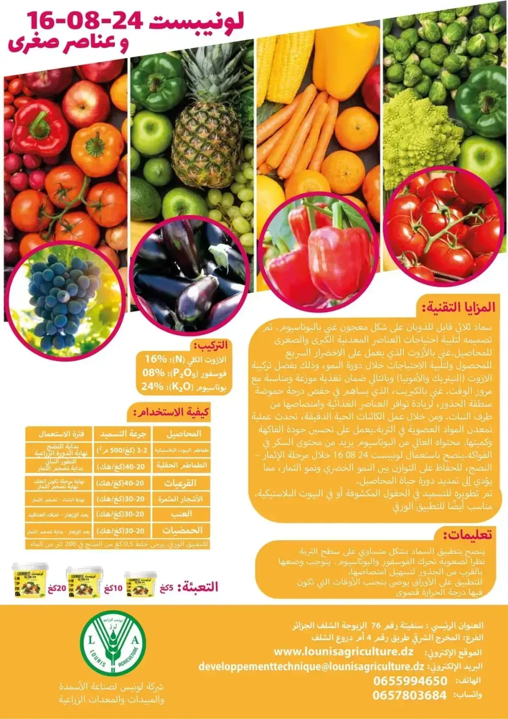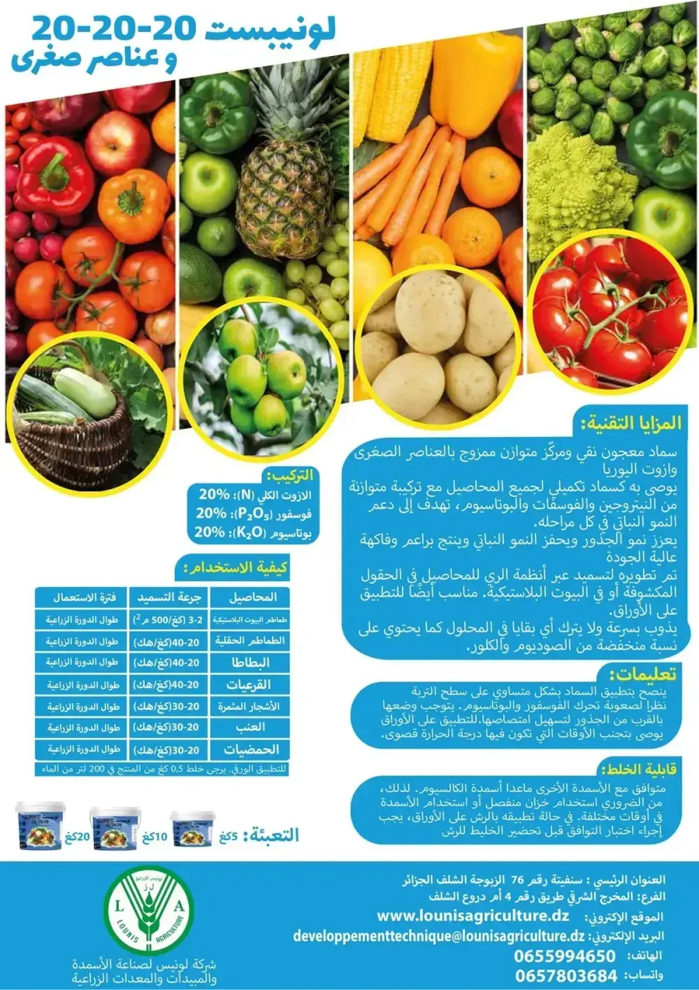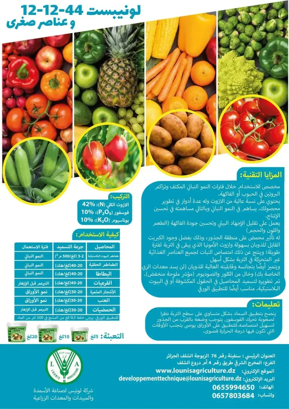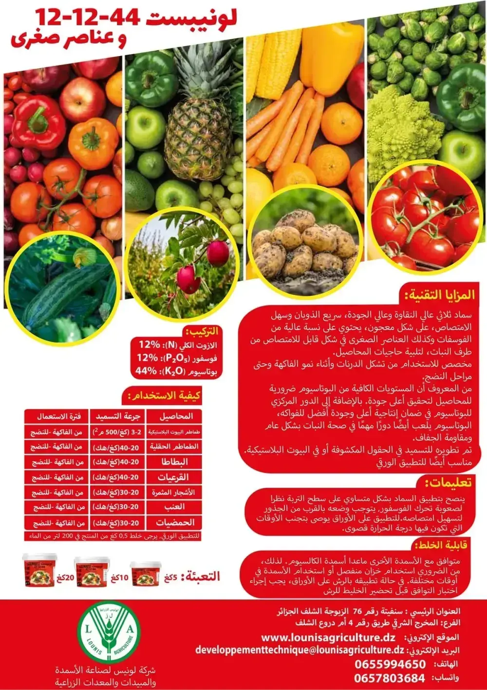 أسمدة سهلة الاستخدام مصنوعة من مواد أولية عالية النقاوة تحتوي على العناصر الرئيسية. نيتروجين فوسفور بوتاسيوم بالاضافة الى المغنزيوم والعناصر النادرة (الزنك ,الحديد, النحاس, البورون, المولبيدينيوم والمنغنيز),أحماض أمنية وفيتامينات.
