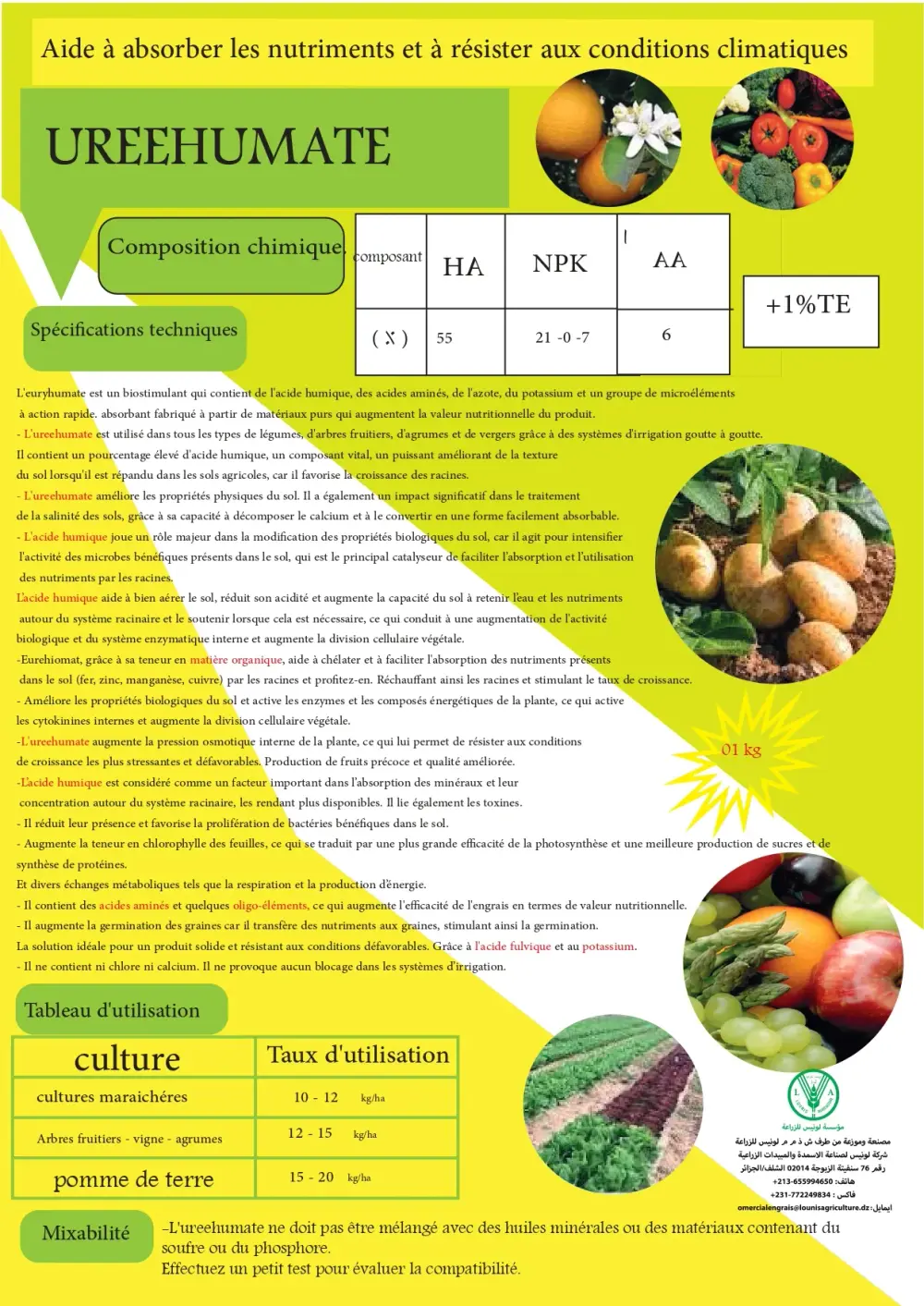 Urehumate is a biostimulant containing humic acid, amino acids, nitrogen, and potassium, designed to increase crop nutritional value and improve absorption.