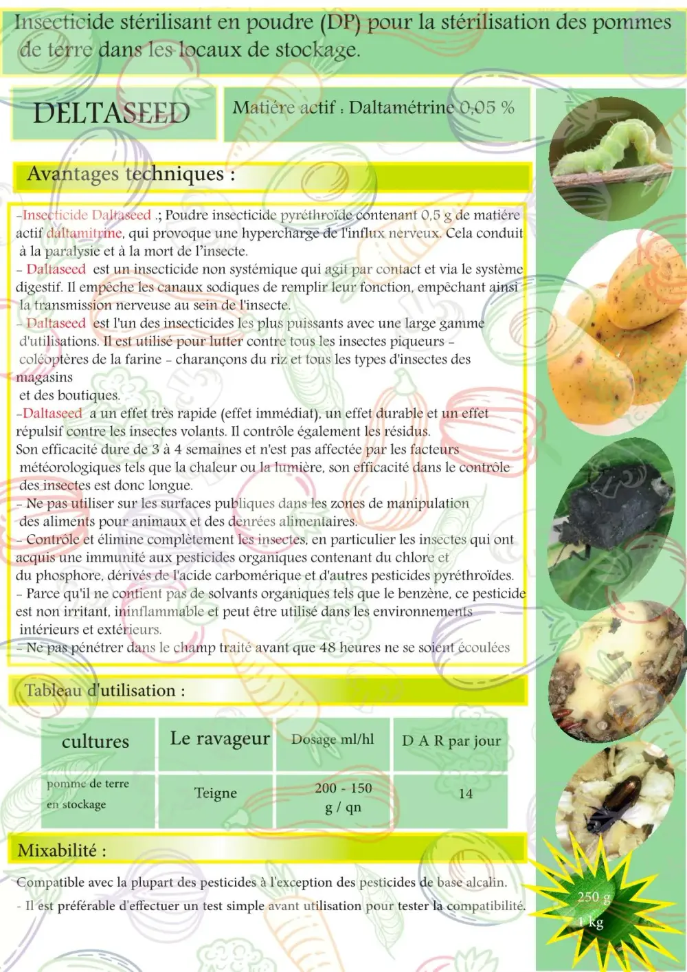 Strong insecticidal sterilization dust from the pyrethroid family dedicated to sterilizing potatoes in storage rooms. Features long-lasting efficacy and a fast, repellent effect on insects without leaving irritating odors.