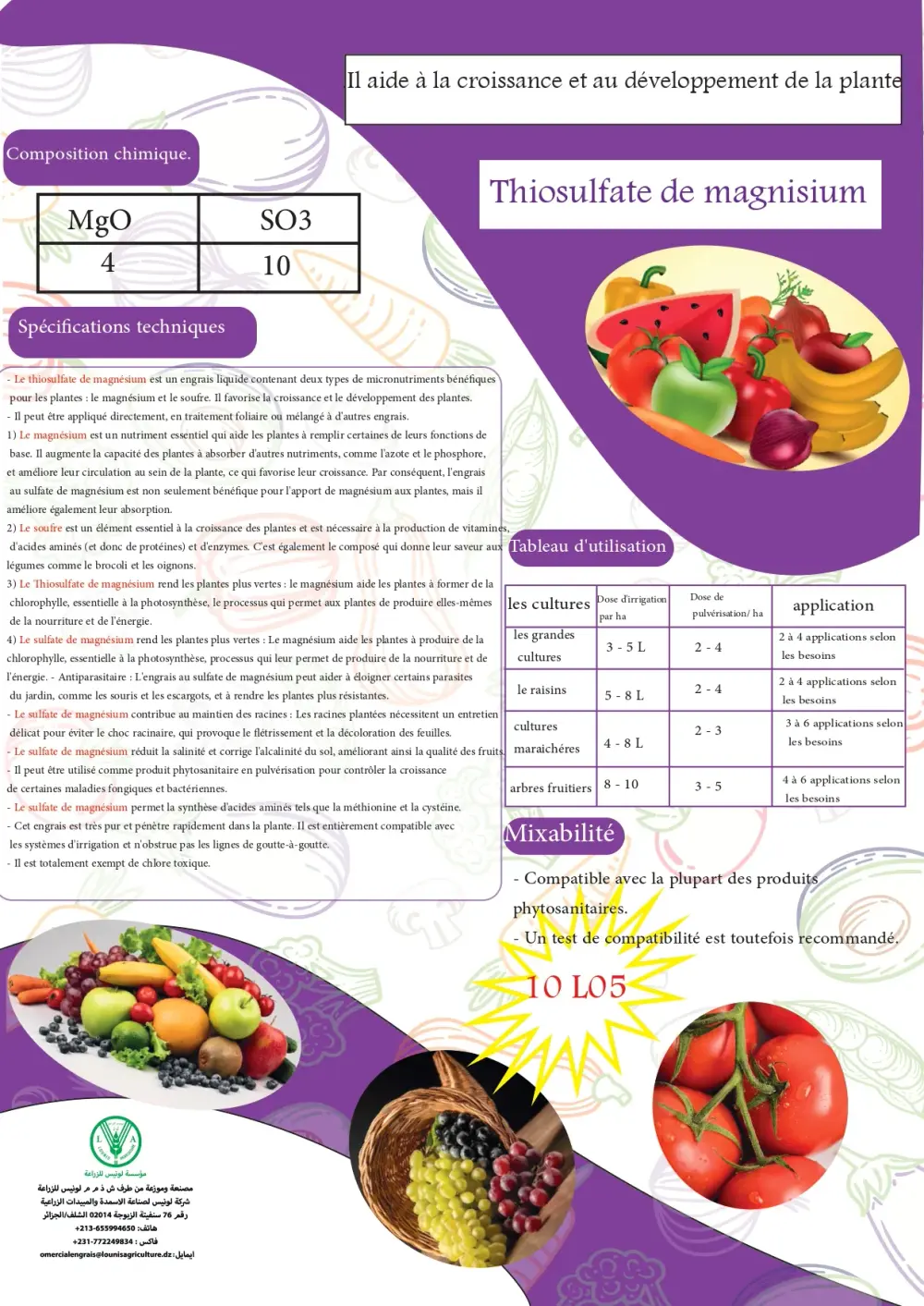 Compatible avec la plupart des produits phytosanitaires. Test préalable recommandé.