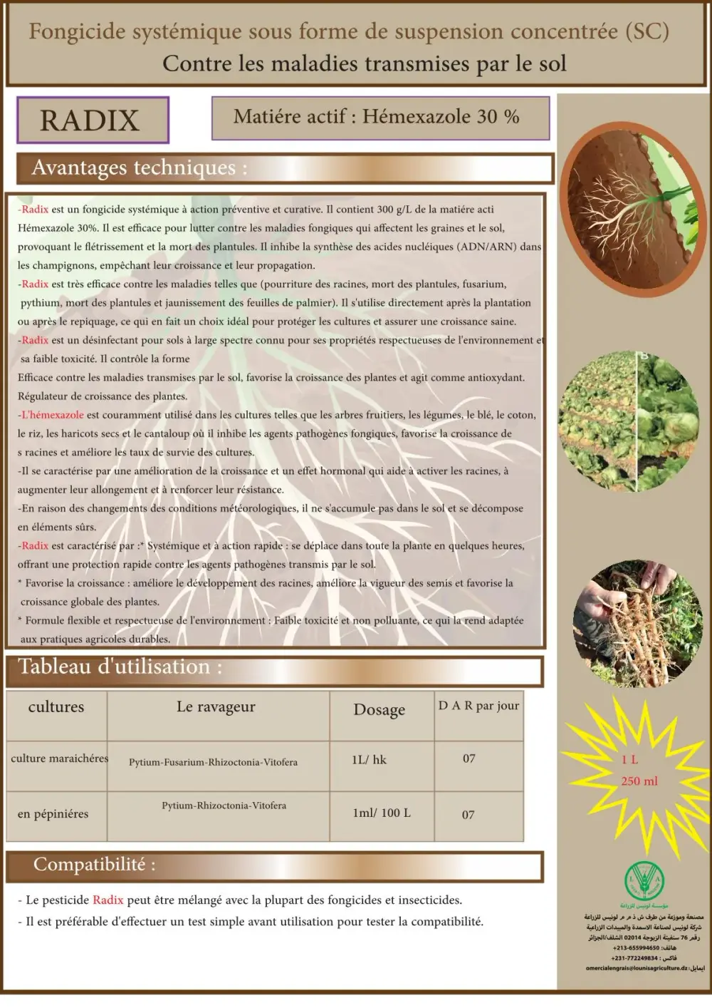 Fongicide systémique à effet préventif et curatif dédié à la lutte contre les maladies du sol. Présente des propriétés qui favorisent la croissance des plantes et stimulent l'enracinement.